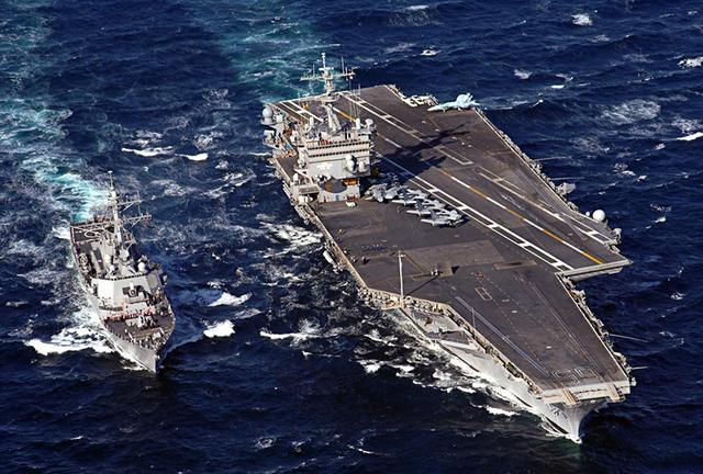 图片为美军航母编队进行大编队快海区机动训练时的情景,据了解,美军航母战斗群编成兵力多, 远离基地在海上执勤时间长,战斗消耗大。军事专家雷泽先生告诉记者,航母是一个海面移动的机场,自身舰体需要大量的补给物资。上面有近百架舰载机起起落落,舰载机也需要补给和维护,由于舰载机种类多,任务重,其装备消耗各不一样,这大大增加了补给的复杂性。我们知道,航母战斗群作战时战场范围广、作战纵深大、参战兵力多,加之海战中需要快速机动,兵力出动强度大,使油料消耗激增。美军核动力航母战斗群在进行作战部署时,日耗油量达1300吨,常规动力航母日耗油量高达1500吨。伊拉克战争期间,“小鹰”号航空母舰在战争第二阶段的五天内出动作战飞机509架次,平均每天达到102架次,超出每天80架次的日平均值,航空燃料JP-5每天的消耗量超出1200吨。