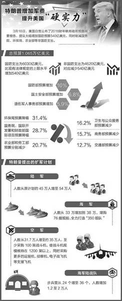 2017年3月16日,美国白宫公布了2018财年联邦政府预算纲要报告,提议大幅增加国防预算540亿美元,同时削减国务院、环保局、农业部等非国防支出,希望在不扩大财政赤字的前提下增强美国国防安全和“硬实力”。