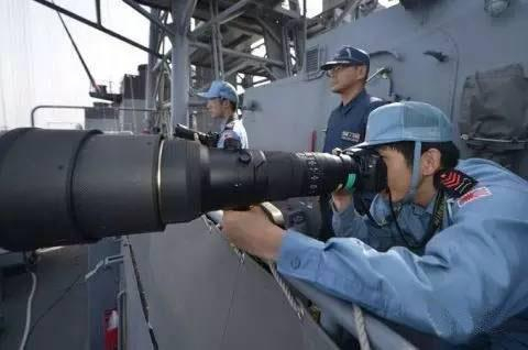 这是海自队员在舰上拍摄的情形,摄影者是位海士长。这款镜头看起来非常霸气,前段还加装了一个大型圆筒形遮光罩,总长度有1米。这款镜头与尼康600毫米远摄定焦镜头比较相像。定焦镜头的优势是可获得较大光圈。
