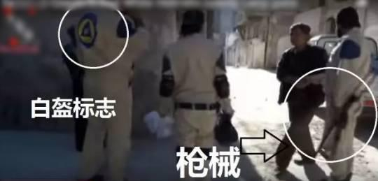 上面这张照片是白头盔摄影师和极端分子合影,关系似乎还不错,下面这张视频截图是持枪的白头盔成员。