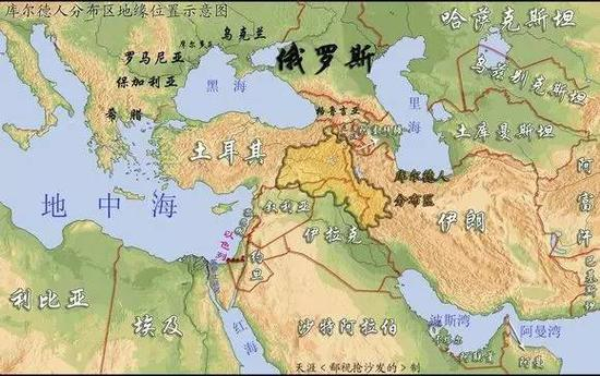 库尔德人是谁?这个说起来可就话长了,库尔德人是长期生活在西亚地区(中东)的第四大民族,仅次于阿拉伯人、土耳其人和波斯人,总人口现在估计在3000万到3500万之间,主要生活在土耳其南部、伊朗北部、伊拉克北部和叙利亚北部,如下图所示。