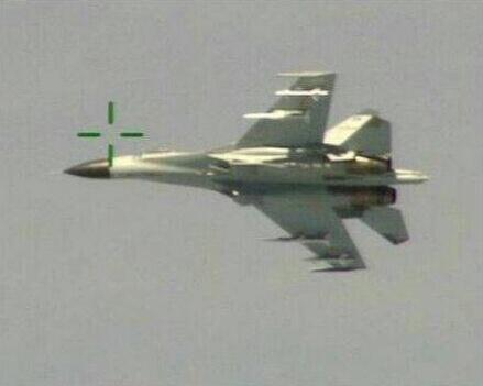 (美军飞机拍摄,逼近拦截美机的中国歼-11BH战斗机,清晰可见机翼下方挂载了多枚实弹。)