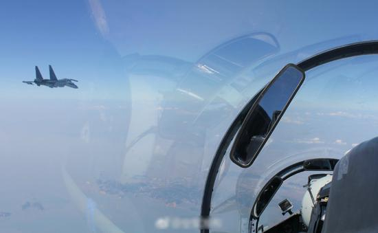 (逼近美军飞机的我军歼-11BH,清晰地看见戴着蓝色头盔的飞行员)