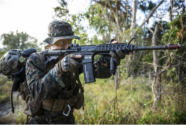 陆战5团3营,在2016年夏天被指定为美海军陆战队首个实验单位,将进行各种新科技、装备、概念,的测试,以探索陆战队未来的发展方向。该单位并于今年5月加入驻扎于日本冲绳的陆战第3远征军第31远征队。图为在演习中的陆战5团3营士兵,他所用的M4突击步枪配备了新型PMAG Gen M3弹匣。