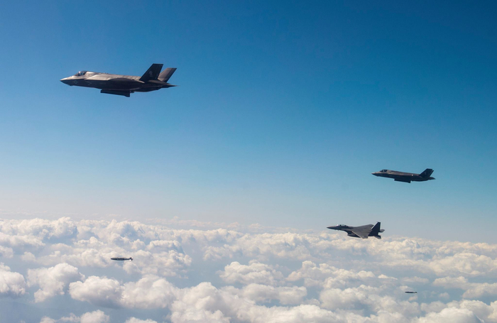 美国军部队部署在亚太地区的最新锐第五代战机“F-35B闪电II战机“,首次于2017年8月30日在朝鲜半岛进行实弹投掷训练,而协同美国陆战队F-35B的还有2架来自关岛安德森空军基地的B-1B枪骑兵轰炸机、2架日本航空自卫队的F-15J以及4架韩国空军的F-15K和美国空军F-16C战机。