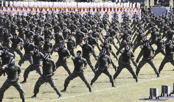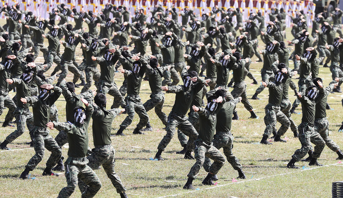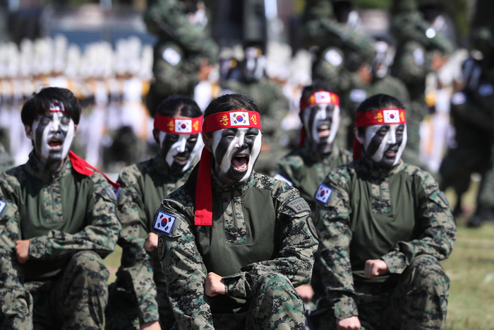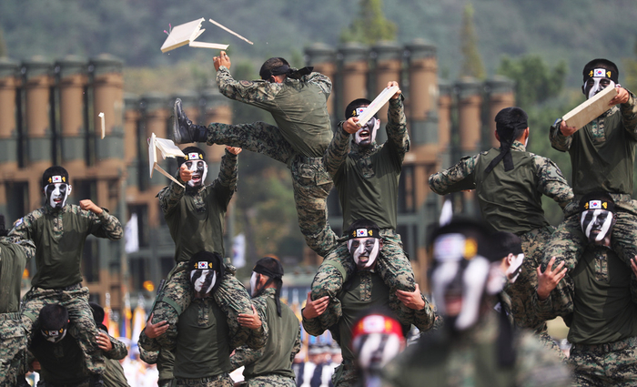 在韩国,男性公民满18岁那一年要进行征兵检查,根据身体健康指数从高到低分为1至7级。其中1至5级分别编入现役空军、现役海军、现役陆军、补充役及第二国民役;6级属于有严重疾病或有精神障碍,可免除兵役;7级则视为无法断定身体状况须次年重新检查。图为进行表演韩军男兵,这个动作看起来像是格斗的起手式。