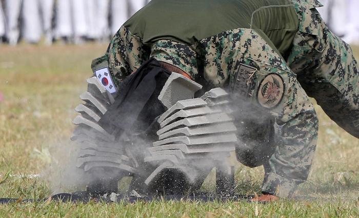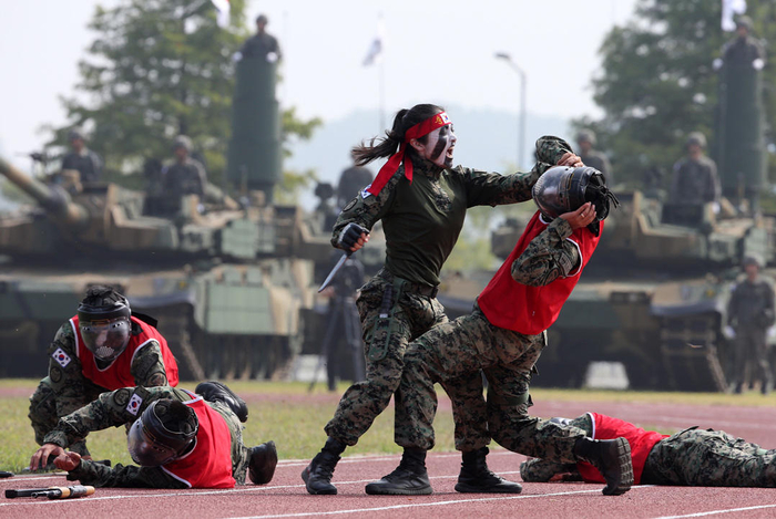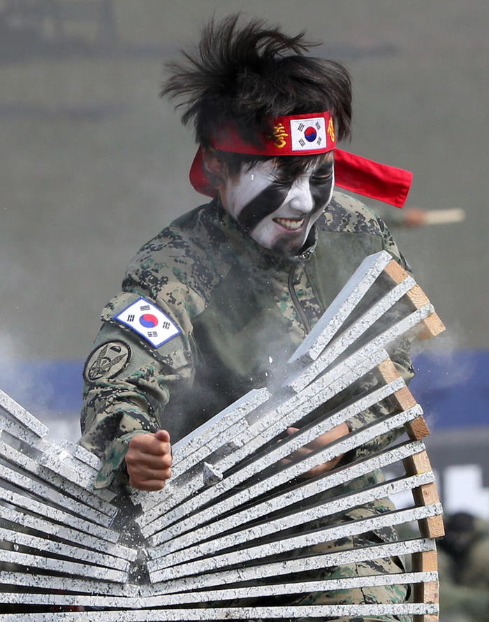 如今,随着越来越多女性开始加入韩国军队服役,女兵的部署范围得到扩大,开始出现在韩军的各个兵种内,从海军到空军陆军,各兵种的相关岗位都有女性士兵们活跃的身影。而此次进行表演的女兵正是来自韩军的特战部队。图为进行劈砖表演的韩国女兵。