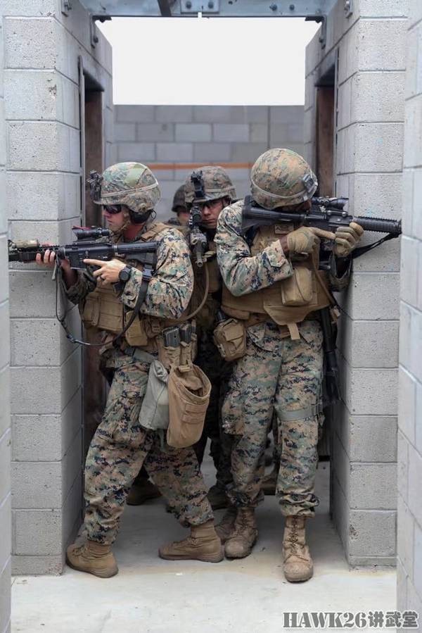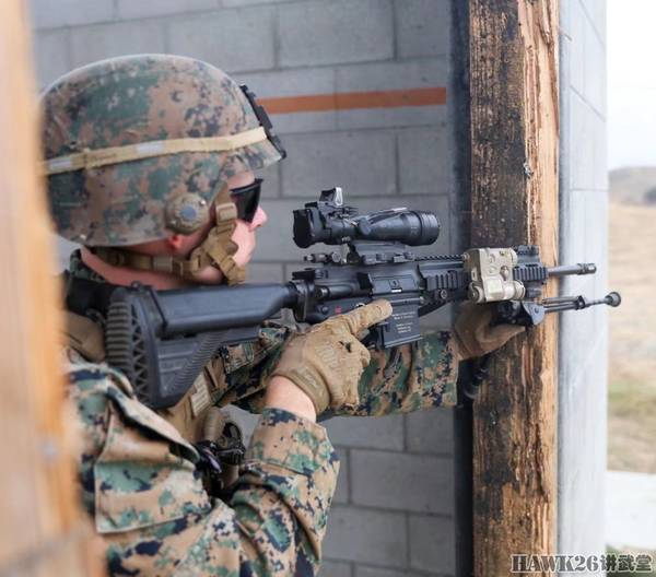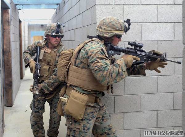 冲进房屋搜剿可疑人员。这名工兵端的是M27 IAR步枪,配备了哈里斯两脚架、激光指示器和ACOG瞄准镜。而他正在使用ACOG瞄准镜上方的微型红点瞄准镜进行快速瞄准。