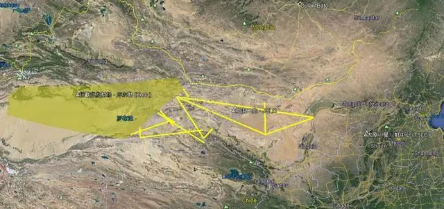 就像上图中所标绘的,黄色楔形三角区域覆盖了大半个塔克拉玛干沙漠,相当于法国本土面积的3/4!