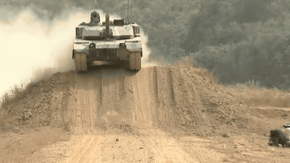 然后VT-4坦克展示了爬坡、涉水、越壕、过弯和直线加速等科目,这些科目主要是考验VT-4坦克的机动性。由于是新装备,泰国军方并没有完全发挥VT-4主战坦克1200马力发动机的性能。现场30度左右的土坡和1米左右的涉水深度,对于VT-4坦克完全是不在话下。