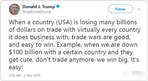 当一个国家(美国)差不多和每个国家进行贸易时都在流失数十亿美元,贸易战就是好的,而且很容易赢。举个例子,当我们和某一个国家的贸易逆差有1,000亿美元,并且对方在耍聪明的话,那就停止贸易——我们会赢得很多。这很简单!