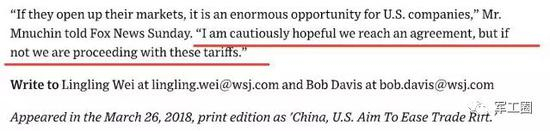 这篇报道的最后则引用美国财长姆努钦接受其他美国媒体采访时的话说:“我对目前双方通过谈判能够达成协议保持谨慎的乐观态度,但如果不能我们就将贯彻我们的关税打击”。