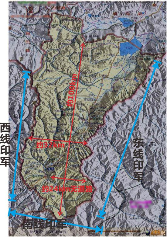 可以发现, 洞朗冲突地区,位于高原山地突出部顶端,这一突出部正面平均宽度约32km,纵深约100km,有些高达4000多米的高峰…整个形状,就像一个大拇指,伸进了螃蟹钳子;其西侧、南侧、东侧,全是印军…从战术层面上看,地缘态势对PLA非常不利。