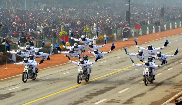 2016年1月26日,在印度首都新德里,印度军队士兵在共和日游行上表演车技。