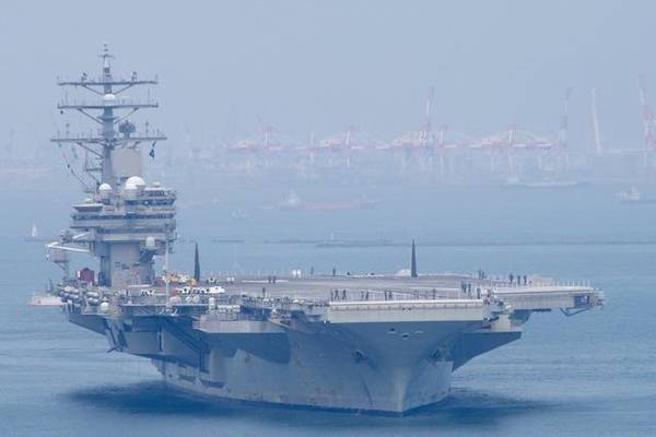2017年8月9日,美国海军的核动力航母“里根”号和日本海上自卫队的“出云”号直升机航母都已经返回横须贺的港口,就像是两者之前都已经约定好了的一样。图为正在入港的“里根”号航母,甲板上没有一架舰载机,全部都收到机库里面去了。