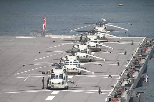 同“里根”号航母相比,“出云”号直升机航母这一次比较高调。在“出云”号的飞行甲板上,5个起飞位处满满当当地停靠着白色的MCH-101直升机。“出云”级直升机航母总共有两艘,一艘是此舰,另一艘是“加贺”号。