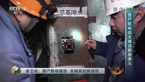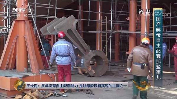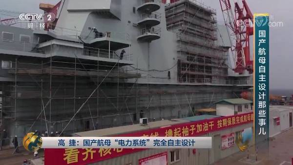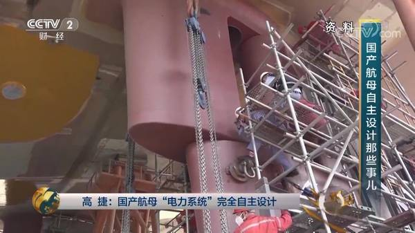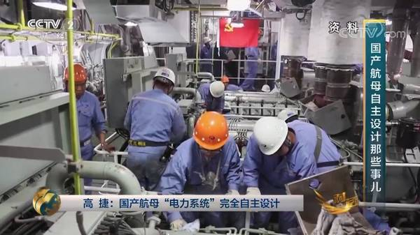 图为国产航母内部动力系统建造场景。现场中船重工701研究所高级工程师陈汝刚称国产航母动力系统是完全自主设计,是国内舰船最大的动力系统,比1000台轿车的总功率还大。他还透露为了建造国产航母,建设国产航母动力陆上模拟动力,用5年收集了上亿组宝贵试验数据。中船重工701研究所高级工程师高捷称国产航母的电力系统是完全自主设计,在辽宁舰的基础上进行了全面的梳理和改进。