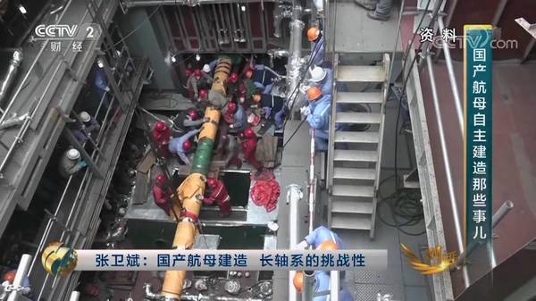 图为国产航母轴系安装。中船重工大船集团副主任张卫斌透露,国产航母轴系长度高达100多米,其精度控制在几个头发丝直径,工作中出现一点点失误,都会导致航母动力无法发挥作用。