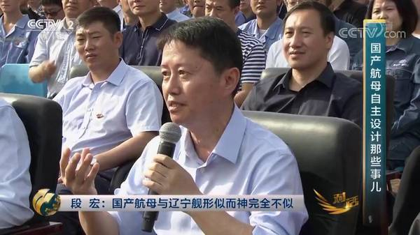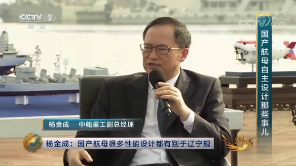 2017年8月20日,央视对话栏目播出了题为《中国航母走向深蓝》的专题节目,在大连造船厂国产航母旁边的码头,以采访专业人士和播放视频资料的方式,首次向全世界公布了中国国产航母的建造过程和技术特点。图为中船重工副总经理杨金成透露国产航母的很多性能与辽宁舰不同。