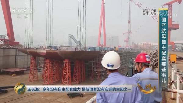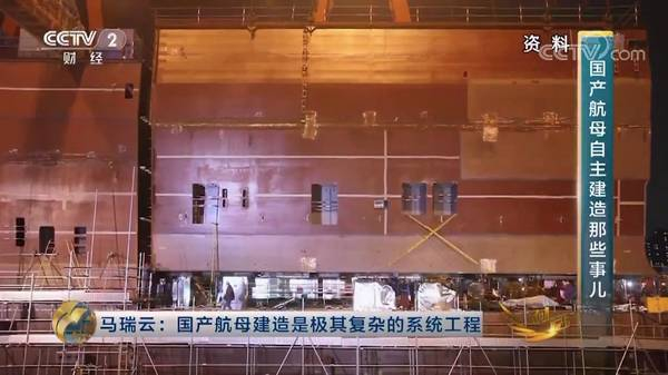 图为国产航母建造现场。鞍钢股份有限公司总经理助理沙孝春透露国产航母的建造,标志我国船用特种钢的突破,其强度和韧性比一般民用钢材高出好几个数量级。鞍钢历时两年才研制出来。