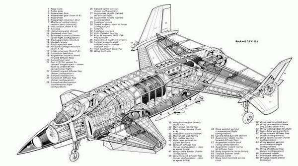 xfv-12战斗机采用鸭式布局,机翼和鸭翼上都有全翼展引射式襟翼增升系统(亦称动力增升机翼);由于多种原因该飞机决定放弃垂直尾翼的传统设计。