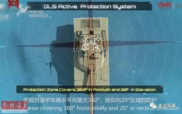 而从官方宣传视频看,国产GL-5型APS起点较高,可以实现水平向最大360度,俯仰向20度区域的防护。在探测和拦截范围上明显优于俄罗斯“竞技场”APS。GL5型APS的系统布置情况,可见探测雷达、传感器以及拦截弹发射器(每个内装有3枚拦截弹)分别布置在坦克炮塔的四角,可实现在水平方向360度全向覆盖。