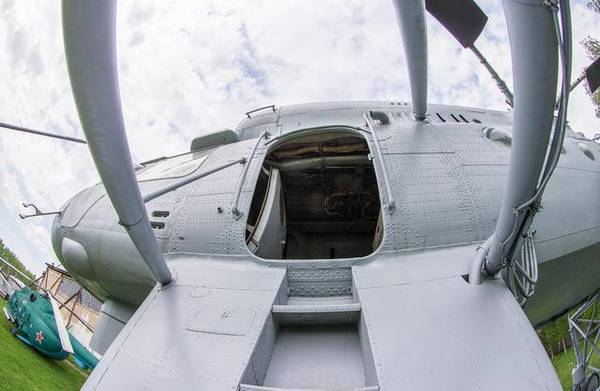 在前部机舱下部的左右两侧,均有一个三角型的结构,上面有梯子。从米-10直升机上下,千万要记住它的起落架很高,否则一脚踩空容易摔个狗啃屎。而且,在摔倒地面上之前,还会乒乒乓乓地在横梁上磕好几下。为了便于参观,在机身后部的侧面,还专门准备有一个梯子。