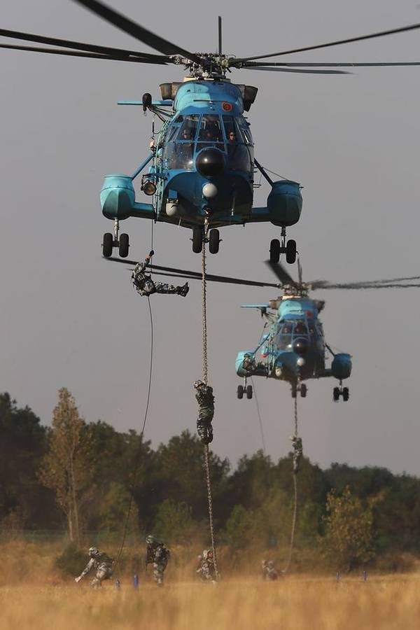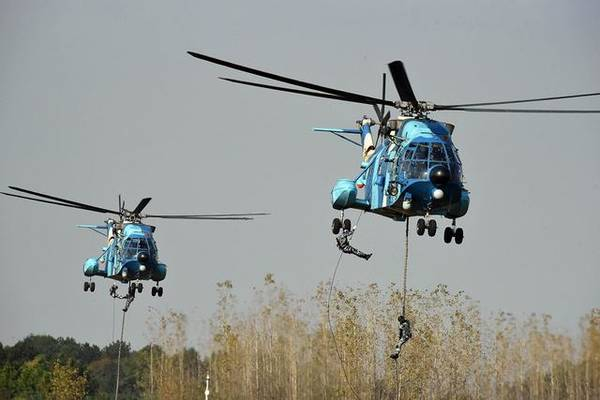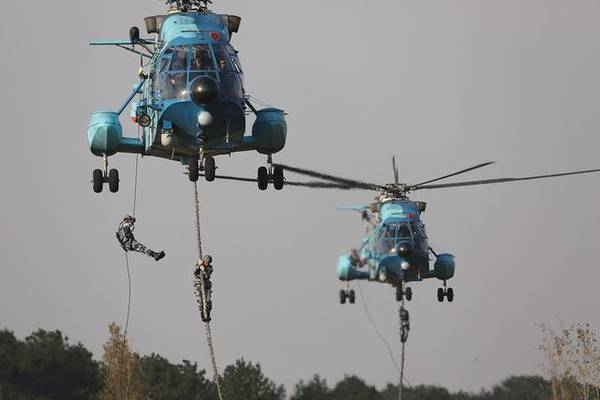 空降兵纷纷从直-8直升机上进行快速滑绳降落训练。