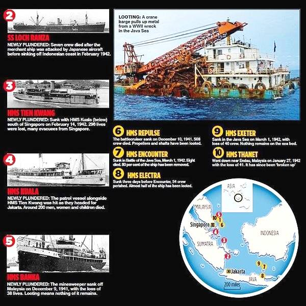第二次世界大战的爆发,导致了9000多万人伤亡、战争损失高达5万亿美元,无数的家庭支离破碎,无数的勇士长眠异乡。而在战争中,英国海军在太平洋和印度洋地区和日军的战斗,使英国海军损失了十艘战舰和舰上的水兵。为了使这些为反法西斯战争付出了生命代价的勇士们得到安息,英国政府特意将这些沉没的战舰设为“战争公墓”,严禁任何未经授权的私人或者组织对这些沉船进行打捞,以免破坏烈士们的安息。但即使如此,近年来却屡屡有不法分子铤而走险,对这些战争英雄长眠的地方进行了破坏性的打捞,令全球军迷气愤不已!