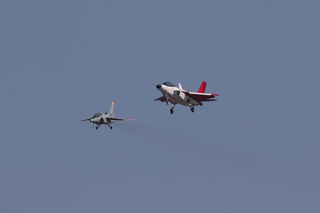 图为10月31日,日本心神验证机在试飞中由T-4教练机伴飞。
