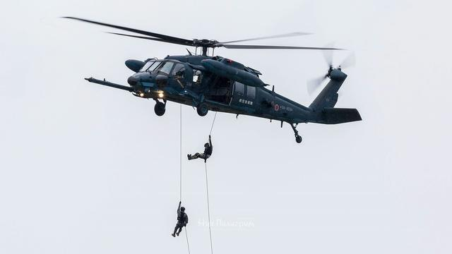 日本组装的首架UH-60J于1987年8月首飞,1992年正式投入服役,截至2010年,共有40架UH-60J在役,主要执行海上搜救任务。图为日本航空自卫队在UH-60J直升机上进行索降表演。