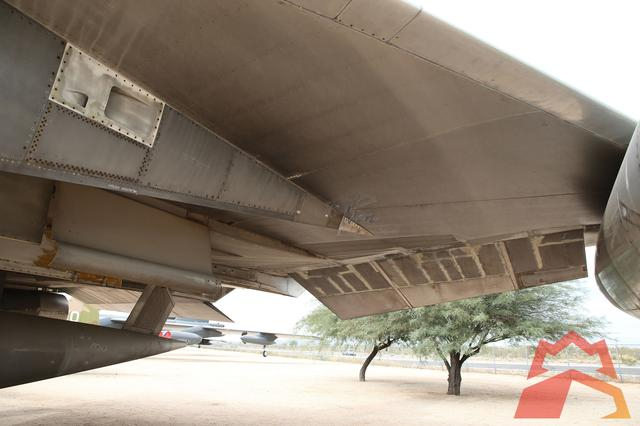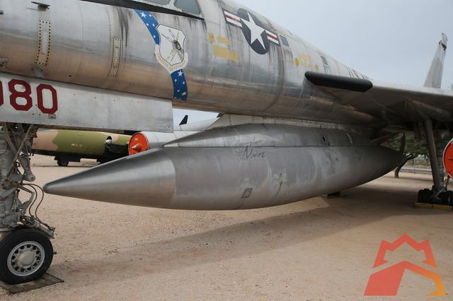 由于服役后,空军对只能携带一枚核武器的轰炸机效用表示怀疑,因此在机身和主起落架之间加挂了4个吊架,每侧两个,用于携带MK43或者MK61系列核航弹。