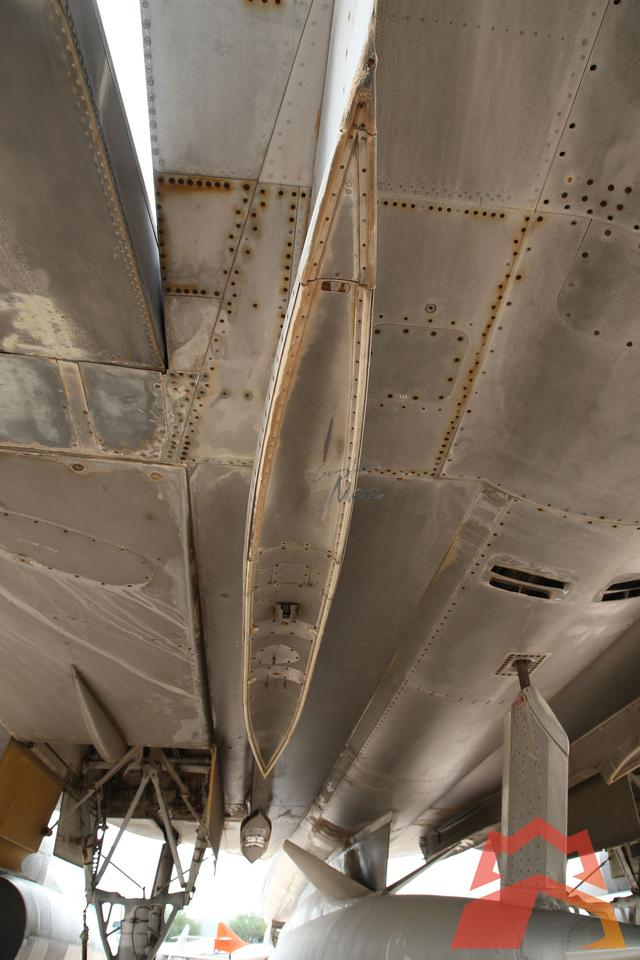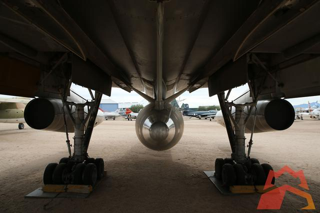 由于机腹吊舱的关系,该机机身离地高度达到了2.75米。我们明显的可以看出B-58轰炸机的起落架设计的有些长,这也是为机腹这个庞大的吊舱留出足够空间。