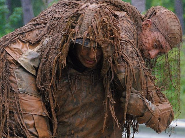 教官传授狙击手如何制作吉利套装,战斗中他们身上的吉利服要和周边环境基本融合在了一起,就如同密林深处中的幽灵一般。