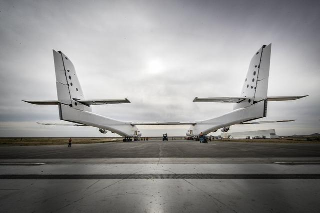 “同温层发射”飞机的后方视角,两个机体之间的距离非常大。由于该飞机采用独特的双机体设计,因此在问世以后就引起了外界的担忧,它如果飞向空中,会不会从中间断掉?就是否会发生这样的情况,也得等到首次试飞升空之后才能得出答案。