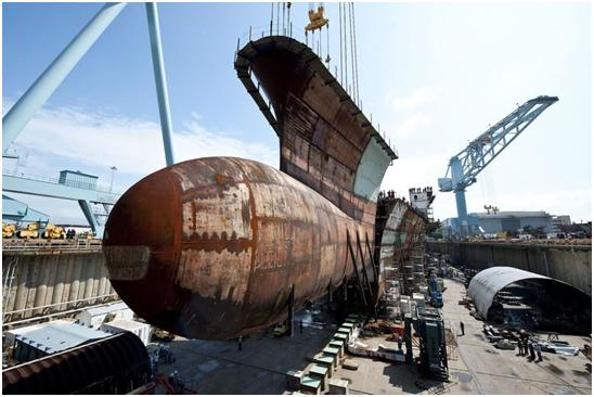 图为船厂当中的航母构件