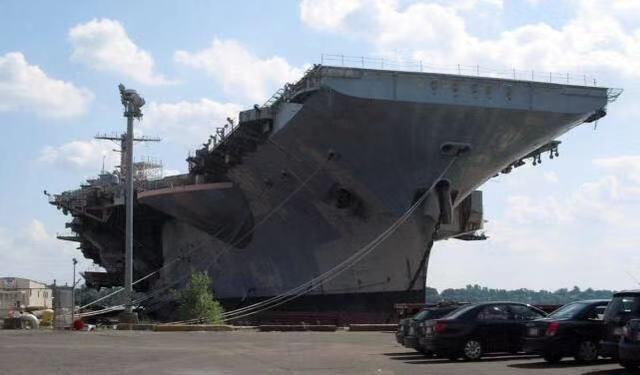 费城造船厂成为了封存舰艇的基地,停放在费城造船厂里的军舰足以武装一支完整的海军,虽说是战舰坟场,但也到处都是宝啊!这里最引人注目的当属小鹰级航母“肯尼迪”号,值得一提的是,美海军最新下水的一艘福特级核动力航母也叫肯尼迪,可见美国人对肯尼迪真的是无比的尊重,小鹰级航母是美海军在上世纪五、六十年代建造的最后一款常规动力航母,八万吨的排水量达到了常规动力航母的巅峰。