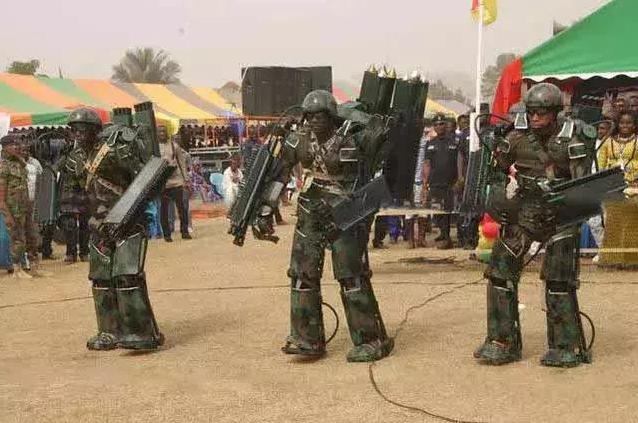 首先引起参观者关注的就是一款加纳版的“钢铁侠战衣”。是的,你没有听错,就是美国漫威电影中超级英雄“钢铁侠”的标配装备。在展会现场,主办方一下子推出了三位“未来战士”,而且是有真人操作的。从造型来看, 三位“未来战士”全身上下都是由护甲包裹(基本可以断定就是普通的钢板),甚至配备了神秘的武器。值得一提的是,他们的武器直接安装在了“机甲”的肩部,和电影《阿凡达》中机甲的配置十分相似。根据主办方的介绍,这款武器居然具有“自动瞄准”和“自动发射”功能,在按动按钮之后,武器系统会从背部缓缓升起,在稳定射击角度后瞄准开火。事实上,这样的设计结构并不稀奇,因为目前世界主流的坦克装甲车都有类似的自动升降门设计。不得不说,非洲老铁的想象力实在是太丰富了。