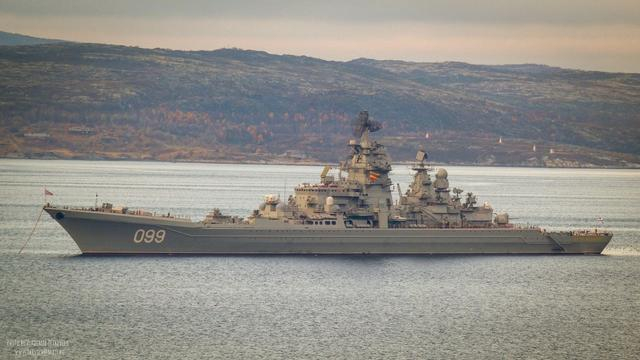 熟悉美国海军装备的军迷应该也能一眼就看出来问题,美国海军虽然是全球第一海军,有11艘核动力航母,但图中这艘军舰浓烈的苏式风格,一看就不是西方海军的军舰,而且这夸张的舰长和上层建筑比例表明这显然不是一艘普通的驱护舰,而是一艘超级巨舰——俄罗斯海军北方舰队的“彼得大帝”号核动力导弹巡洋舰。