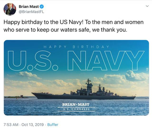 这是美国国会议员布莱恩·马斯特为美国海军成立244周年纪念日送去的祝福,乍看上去没什么毛病,碧海蓝天巨舰,很符合美国海军在大众心目中的形象,布莱恩·马斯特配的文字也很高大上,视觉效果相当不错。但要命的是,这位老哥选错了图,这让他所做的一切努力都化为了泡影。