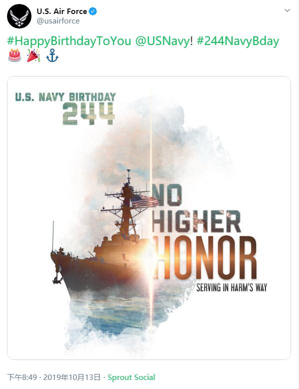 这是美国空军官推为美国海军送上的生日祝福,文案和配图都比较走心,高度赞扬了美国海军。有一说一,虽然美国海空军时不时因为一些鸡毛蒜皮的小事儿吵得不可开交,但是在一些大场合上,两个军种都不会掉链子,“商业互吹”什么的更不在话下,逢年过节互送祝福自然也不会落下。