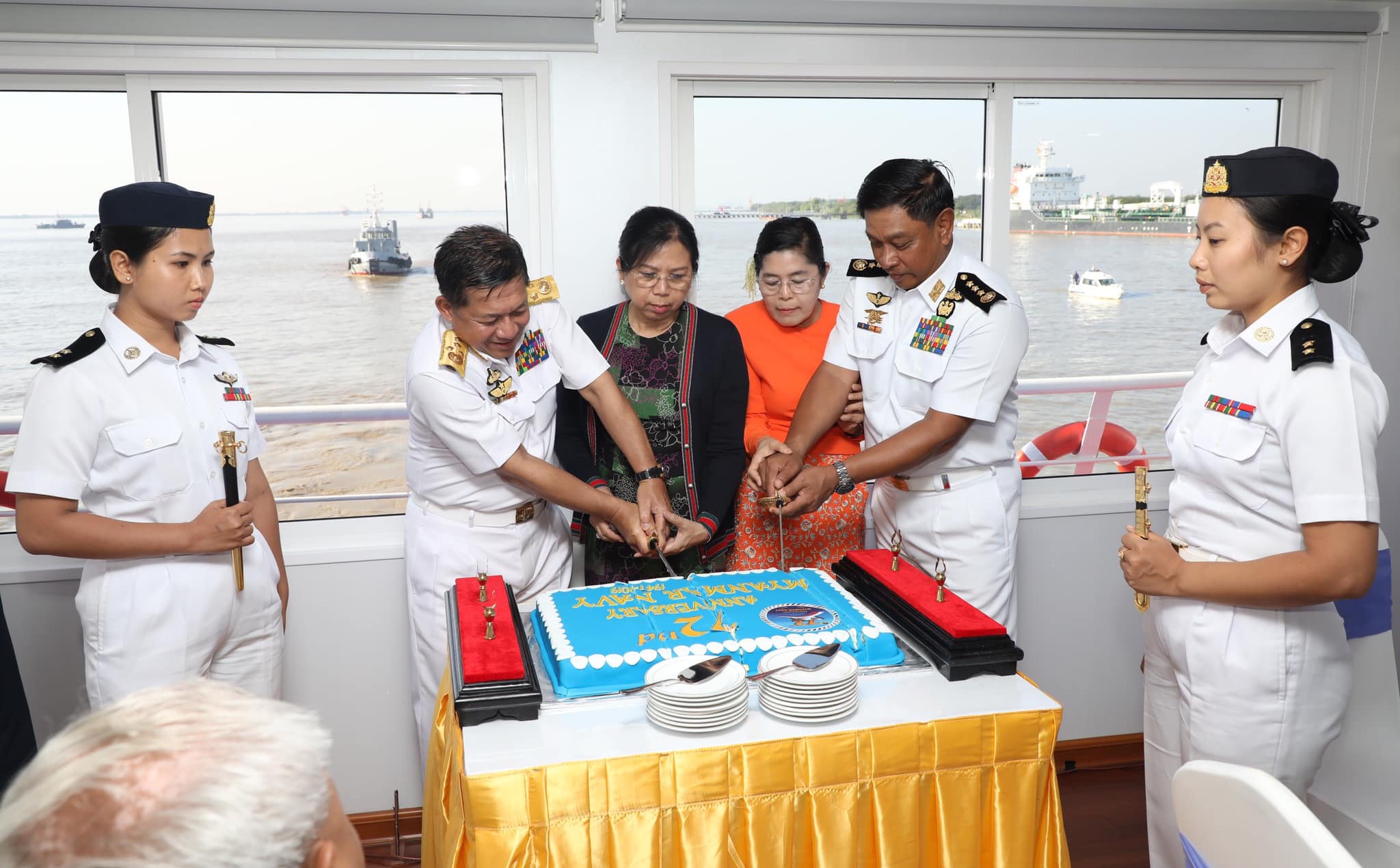 缅甸军方将领切开一个带有海军成立72周年字样的蛋糕。