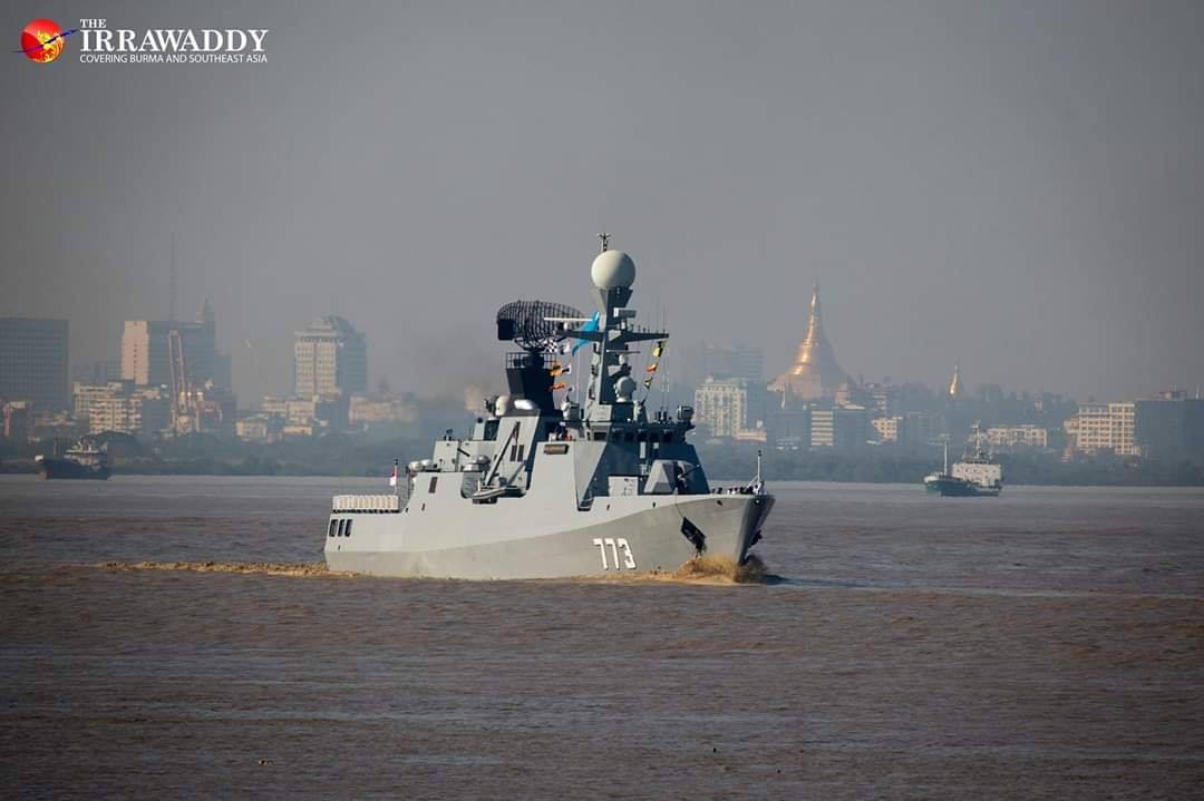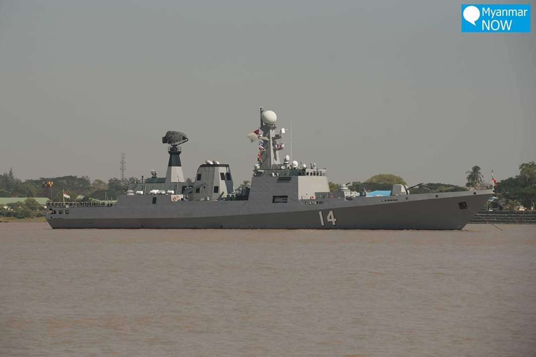 这是接受检阅的缅甸海军舰艇部队。缅甸海军近年来急速发展,与不少东南亚国家以买外国军舰为主不同,缅甸海军则鼓励本国造船厂为海军设计建造军舰。比如阅舰式上打头阵的就是该国自行设计建造的辛标信级护卫舰,目前已经建成3艘,算是一艘不错的导弹护卫舰。