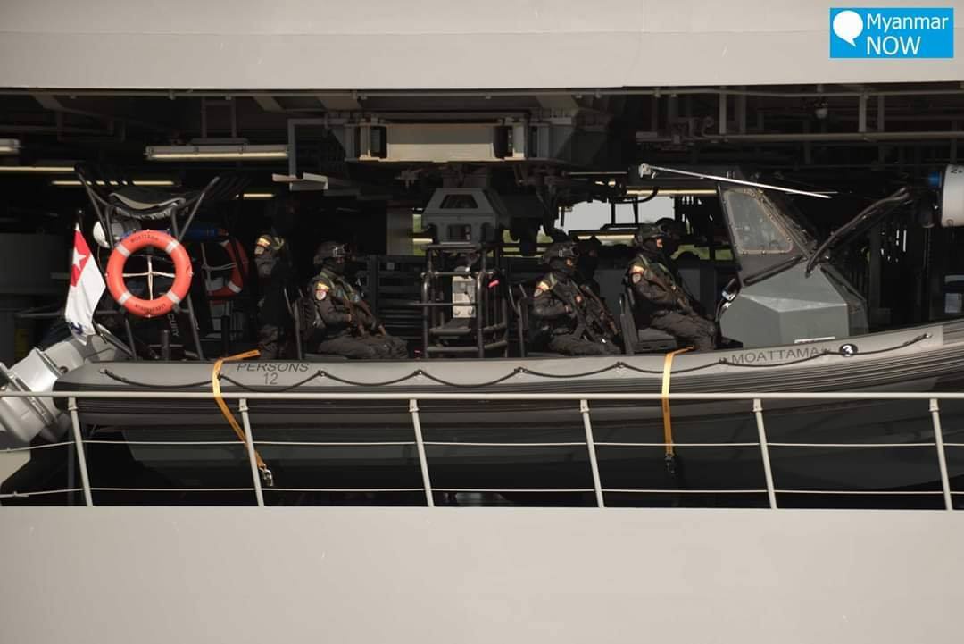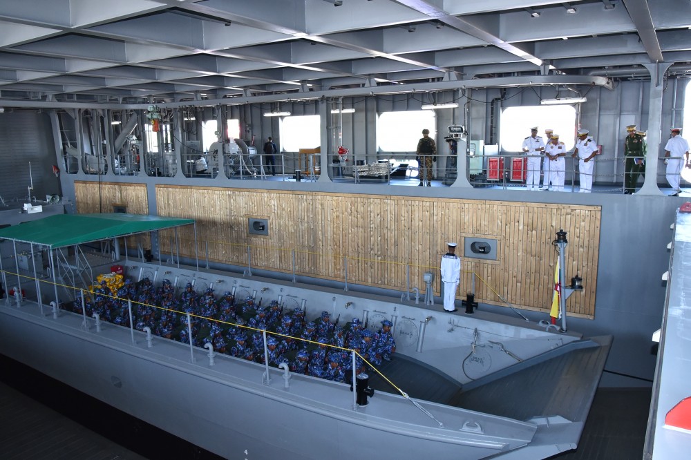 缅甸军方将领视察“莫塔马”号两栖船坞登陆舰上的突击队,乘坐着硬式橡皮艇。
