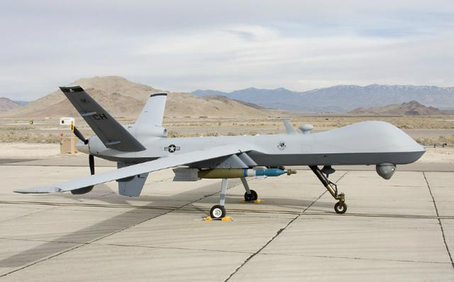 MQ-9型无人机并不是什么新式武器,早在2002年时,该机就已经完成了首飞,2003年是就已经定型并量产装备美军部队。MQ-9"收割者"无人机使用一台功率为900马力的涡轮螺旋桨发动机,它的飞行速度可以达到460千米/小时。此外,它的载弹量也是目前美军无人机中最大的,MQ-9一共装备6个武器挂架,可搭载"地狱火"导弹和500磅激光制导炸弹等武器。而且最重要的是MQ-9无人机的续航时间长达15个小时,即使武器全部打光,也可以长期在战区上空巡逻,为地面部队提供目标指示,或者侦查服务。