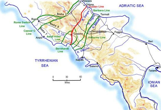 在1944年的地中海战场上,意大利已经基本崩溃,盟军不但顺利登陆北非和西西里,甚至已经顺利登陆意大利本土。反对墨索里尼的意大利统治集团发动政变,推翻了墨索里尼的统治。但是德国却舍不得这个猪队友,希特勒最终还是派遣敢死队将墨索里尼营救出来,并重新扶植其在意大利掌权。并且派遣陆军元帅凯塞林在意大利中部建立著名的"古斯塔夫防线",以阻挡盟军的推进。