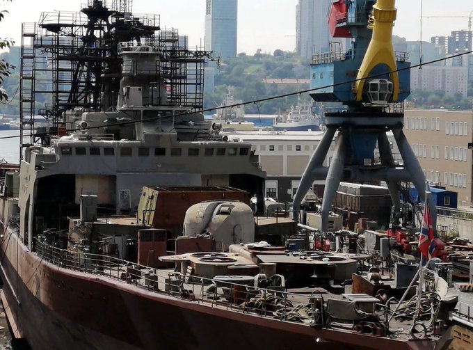 火后,俄罗斯又加快了该舰的改装过程,注意照片中B炮位已经焊接上了一段高高的导弹垂直发射基座,突出一大截看上去很不协调。主要是导弹发射井的井深要大于以前火炮的炮井深度,这就只有突出一截了。该舰本来预定2019年底完工,目前看来能够在2020年内完工已经是谢天谢地了!