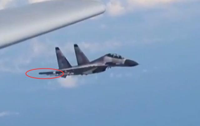为轰-6K战略轰炸机护航的两架战机中,出现了一架涂装明显有别于近处深灰色涂装苏-30MKK的战机,不少媒体将其研判为印尼空军的苏-30MK2战斗机。