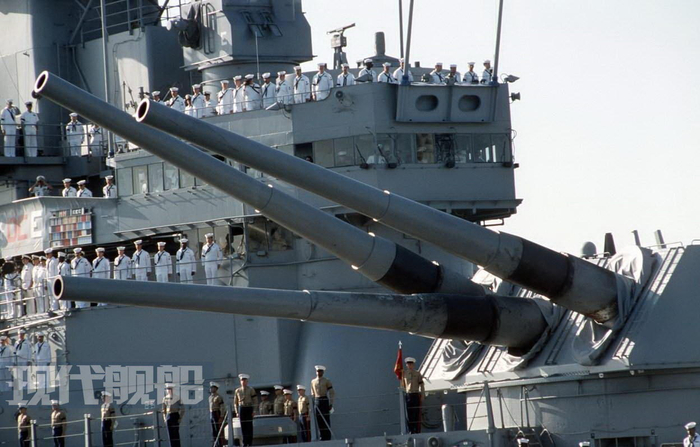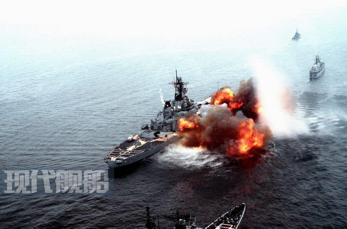 衣阿华级战列舰在80年代在里根政府600艘舰艇计划背景下重新服役,这是一艘该级舰在海上编队演练中进行三门主炮的半齐射练习,注意右侧的42型驱逐舰和右下方的提康德罗加级巡洋舰。