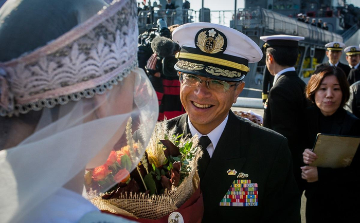 2017年10月14日,日本海上自卫队的“春雨”号驱逐舰和“鹿岛”号训练舰抵达俄罗斯太平洋舰队的基地符拉迪沃斯托克。图为日本海上自卫队官员看到俄罗斯的姑娘,脸都笑开了花。